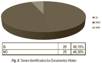 Sin embargo cuando se hizo referencia al alcance de un Programa de Documentos Vitales y su relación con los planes de contingencias y seguridad de la información, se preguntó si las entidades tenían identificados los documentos vitales necesarios para restablecer el funcionamiento de sus actividades luego de ocurrido un siniestro, Figura 8, el 48% de las entidades sostuvieron que sí tienen identificados dichos documentos, en tanto que un 46% contestó no haber realizado acciones sobre este aspecto.