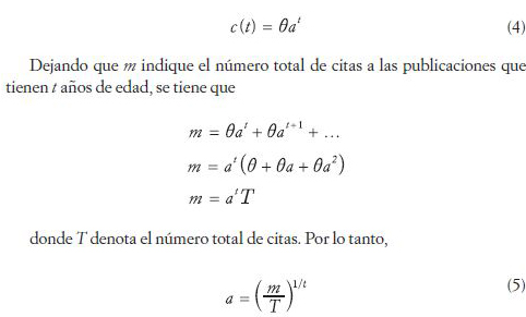 Sin embargo, en la práctica ocurren muchas fluctuaciones en los valores de las citas con cero años de obsolescencia o con los primeros cinco años de obsolescencia. La mejor manera de superar este problema fue propuesta por Brookes (1973). Entonces, asumiendo como verdaderas las ecuaciones (1) y (2), se puede escribir que