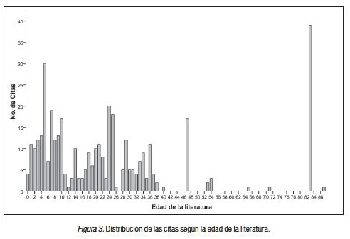 La Figura 3 muestra la distribución de las citas ordenadas de las más actuales a las más antiguas. A pesar de observarse un crecimiento de las citas en los primeros 5 años no se observa un patrón de obsolescencia definido, pues es notoria la oscilación de las citas representadas en el gráfico de barras. Por ejemplo, las barras más elevadas representan, respectivamente, las publicaciones más citadas de autores como Alfred Lotka, Miranda Lee Pao, John Derek de Solla Price, Ronald Rousseau, Paul Travis Nicholls y Leo Egghe. Si no fuera por estos autores las citas se agruparían en cuatro sectores bien diferenciados; tres de estos grupos bastante cohesionados y el último muy disperso.