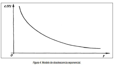 No existe un patrón de obsolescencia definido. Un patrón de obsolescencia exponencial mostraría una caída desde el punto inicial descendiendo constantemente hasta el final de la distribución. Esa caída no se muestra claramente en el gráfico de barras mostrada en la Figura 3. Esa caída debería ser muy parecida al trazado de la Figura 4.