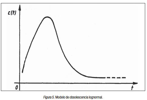 Un patrón de obsolescencia lognormal mostraría una subida inicial muy lenta, para luego llegar a un tope máximo en los primeros cuatro o cinco años. A partir de ese punto máximo de inflexión comenzaría a descender hasta el final de la distribución. Ese crecimiento inicial, a pesar que parece mostrarse en los primeros cinco años, es muy irregular y no conforma un proceso de obsolescencia lognormal real y consistente en la Figura 3. La Figura 5 ejemplifica lo que debería ser un modelo de decrecimiento lognormal.