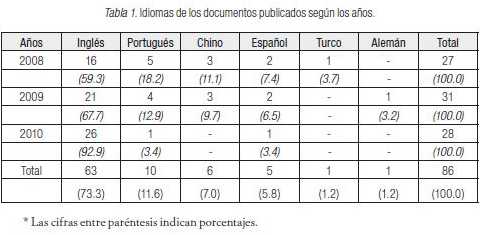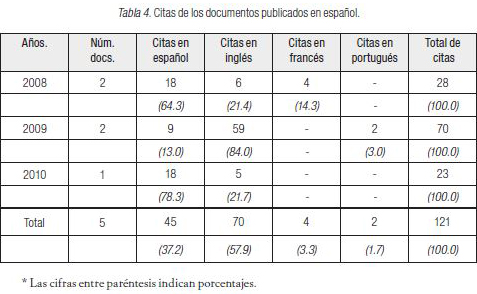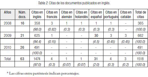 La Tabla 2 muestra los idiomas citados por los 63 documentos publicados en inglés en el periodo de estudio (20082010). Consistentemente, a través de los años quienes publican en inglés sólo citan documentos en inglés. Por ejemplo, en el año 2008 se publicaron 16 documentos en inglés y estos documentos citaron 358 veces otros documentos también publicados en inglés que representaron un 98 % de todo lo citado ese año. Igualmente, en el año 2009 se citaron 662 veces documentos escritos y publicados en inglés que representaron el 94.4 % de todo lo citado ese año. De los 26 documentos publicados en inglés en el año 2010, todos ellos (100 %) sólo citaron otros documentos publicados también en inglés. En general, en los tres años analizados, 97 % de las citas son de documentos publicados en inglés.