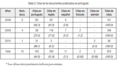 Esto no parece ocurrir con aquellos que publican documentos en otros idiomas. La Tabla 3 muestra los documentos publicados en portugués. Los 10 documentos publicados en el periodo de la investigación realizaron un total de 353 citas a otros documentos publicados de 1926 a 2007. De estas 353 citas, 44 % fueron a documentos publicados en portugués y 52 % a documentos publicados en inglés. Solamente en el año 2010 hubo una alta concentración de las citas a documentos en el mismo idioma portugués (86 %). El acompañamiento a las publicaciones en inglés parece ser permanente, consistente y a la par del portugués. El acompañamiento a publicaciones en otros idiomas es poco significativo, es decir, el seguimiento de las publicaciones en español, francés y alemán es casi nulo. Claramente, quienes publican en portugués, además de lo que se publica en el contexto cultural nacional, acompañan la producción de quienes lo hacen en inglés.