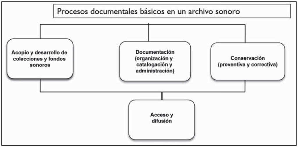 La IASA estableció que en los archivos sonoros se llevan a cabo cuatro tareas básicas: acopio, conservación, documentación y acceso.10 Para desarrollar estas tareas el archivista o documentalista sonoro debe manipular cada ítem sonoro para identificarlo, aplicar técnicas y tecnologías para la conservación preventiva o correctiva, ubicarlo para su organización física en la estantería y bóveda, mantener la temperatura y humedad relativa en las bóvedas, catalogar el documento sonoro y hacer una copia del mismo para su escucha como parte del servicio de acceso (ver Figura 1).