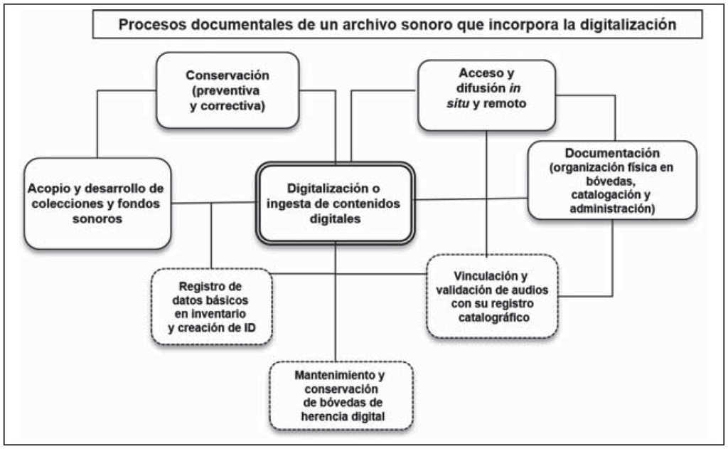 La digitalización y la ingesta de contenidos digitales en plataformas digitales modificaron los procesos documentales tradicionales e incorporaron nuevos flujos de trabajo y tareas en el archivo, entre los que podemos citar la creación de un ID o clave de identificación permanente que vincule el audio digital (media o esencia) con la metadata, la validación y la verificación sistemática tanto de la catalogación como de la digitalización, el acceso inmediato a los contenidos y a los datos del inventario una vez digitalizado el ítem, acceso remoto, la verificación permanente de la integridad y consistencia tanto del audio digital como de la metadata, la realización diaria y periódica de copias de seguridad de la media o audios digitalizados y de los metadatos y mantenimiento, control de temperatura y humedad de la bóveda de herencia digital, entre otros.16
