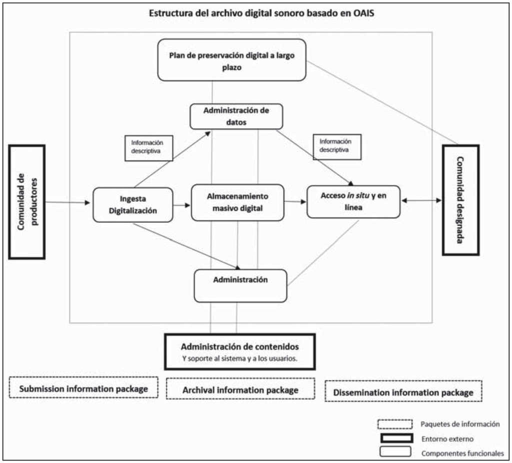 Además, OAIS contribuye a entender la transición del documento sonoro como objeto digital a partir del término paquetes de información, que incorpora el contenido sonoro digital y los metadatos. Los paquetes de información participan del ciclo de vida del objeto digital. Por otra parte, en lugar de los procesos documentales que se desarrollan en un archivo con documentos analógicos, en el archivo digital se advierte la presencia de componentes funcionales: ingesta, acceso, administración, planeación, gestión de datos y almacenamiento de archivos. Asimismo, en OAIS se pueden identificar roles en la interacción y participación de los productores o creadores de documentos sonoros, de la comunidad designada o usuarios, así como de los administradores y gestores de contenidos.