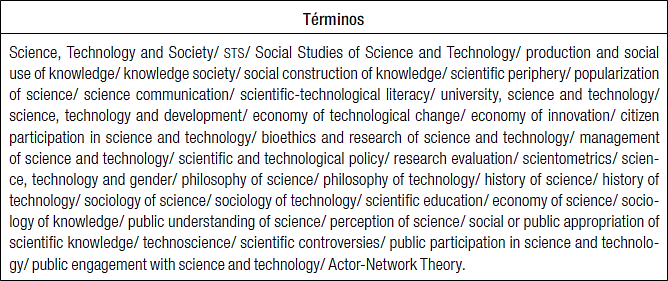 Para el segundo requisito, a partir de una revisión bibliográfica, se han seleccionado términos específicos que aluden a las temáticas CTS. Tras la elaboración de un listado inicial de términos (discutidos en el marco del Instituto inaecu), se realizó una validación por expertos de la región en diversas disciplinas. Se ha contado con la validación de diez investigadores de sociología de la ciencia y la tecnología, innovación, comunicación pública de la ciencia, bibliometría y filosofía de la ciencia de Argentina, Brasil, México y España, todos ellos pertinentes a la red Iberoamericana de Estudios Sociales de la Ciencia y la Tecnología (Esocite).