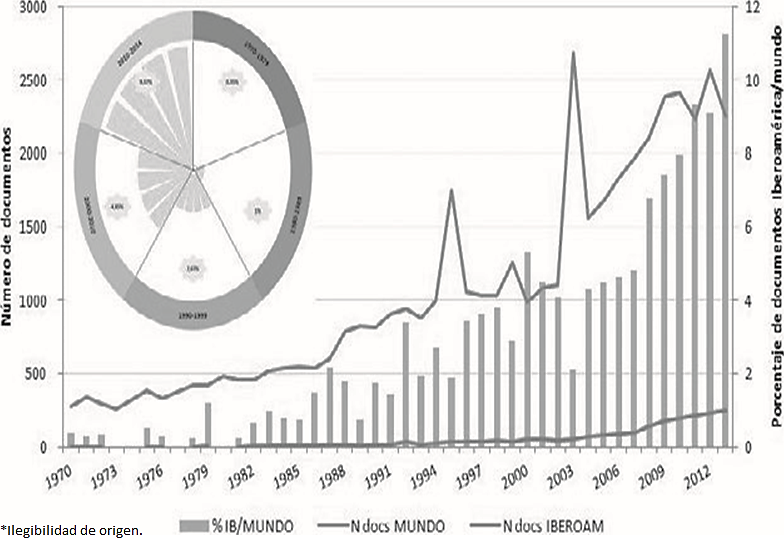 Tras un primer análisis de los documentos de todo el mundo, se han seleccionado los correspondientes a instituciones de Iberoamérica (filtrado por país firmante) y se han obtenido los principales indicadores bibliométricos. El periodo analizado corresponde a los años 1970-2013 (De Filippo, 2014).