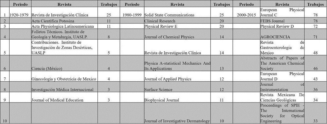 En el periodo 1980-1999, que denominaremos como de cimentación, se contabilizaron 246 fuentes, de las cuales se muestran 10 en el Cuadro 2, el total de trabajos en el mismo periodo representa el 33%, dejando una larga lista de revistas en las cuales, aunque dispersamente, también se publicó. En el último periodo del Cuadro 2 que se describiría como en proceso de consolidación, se muestran 10 de las 1,538 revistas, dejando ver la variedad de temas (medicina, química, física, geología y agrociencias) que se abordan a través de las disciplinas que se cultivan en las instituciones potosinas, tan sólo en la muestra de diez títulos se concentra el 14%.