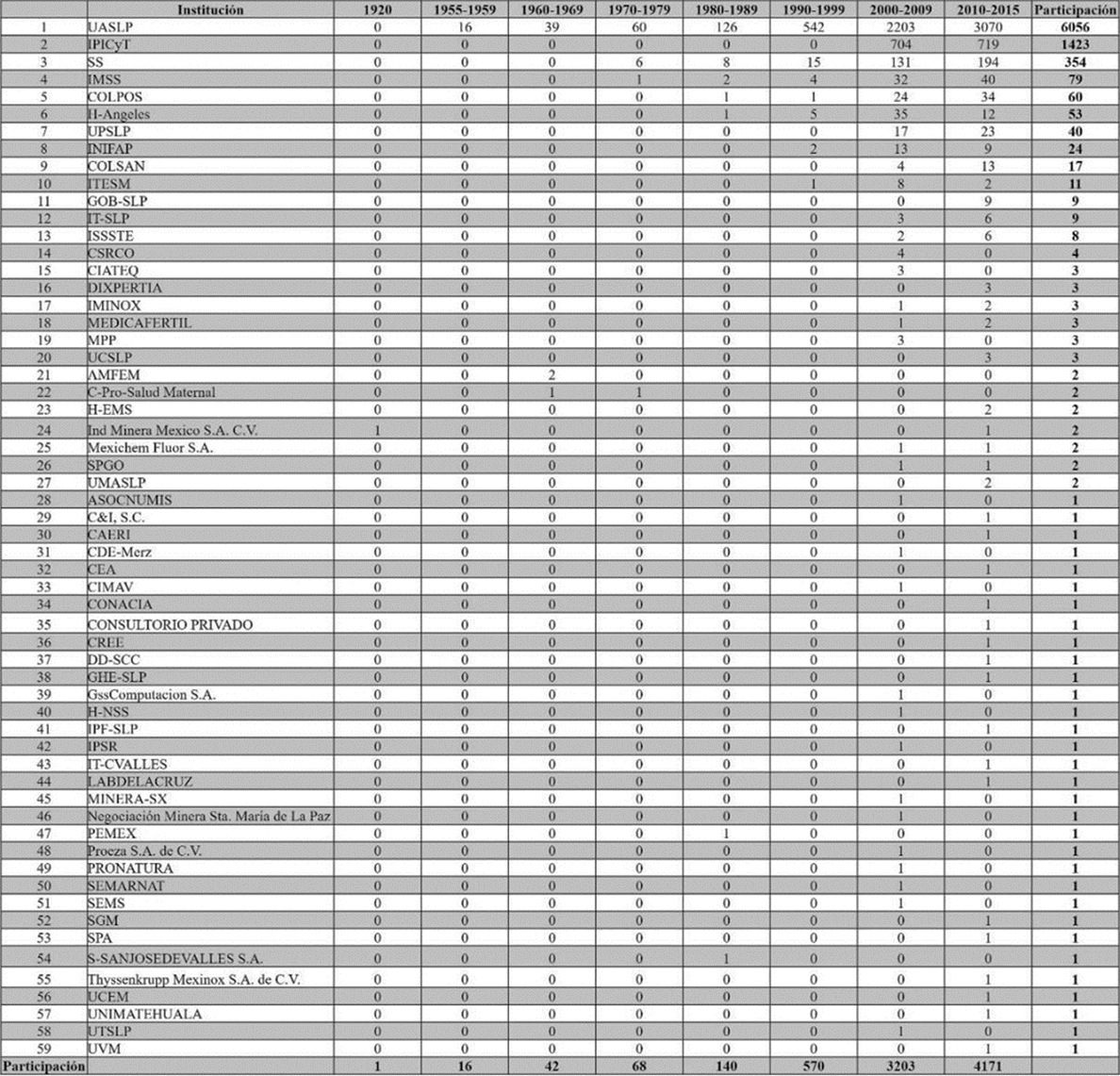Se habla de participaciones y no de documentos individuales, ya que, como se mostró antes, la producción científica de SLP tiene una alta participación de trabajos en colaboración, por lo que en un mismo registro bibliográfico, de los 6,574 que se recuperaron, puede contener más de una dirección de alguna institución potosina. Así pues, en la última columna de izquierda a derecha se cuenta el total de participaciones por institución, y en la última fila de nuevo se hace una sumatoria de participaciones, ahora por década analizada.