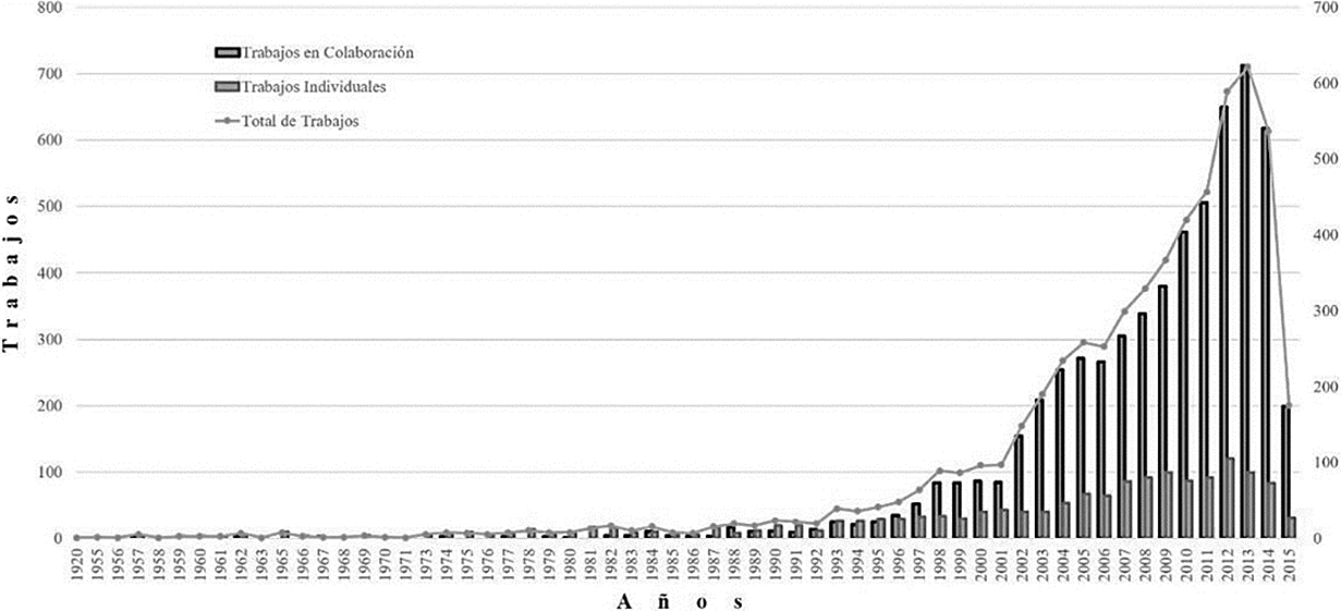 Cabe señalar que los trabajos en colaboración son predominantes en los años finales del estudio. En las primeras décadas de la Figura 1 son más los trabajos individuales. Durante más de treinta años se privilegió la publicación individual a la de participación con otras instituciones, nacionales o extranjeras; y hacia los últimos años se ha adoptado un claro interés o necesidad de colaborar, posiblemente reflejando además la circunstancia de que los problemas a estudiar demandan técnicas o visiones que por necesidad aportan más de un solo individuo.