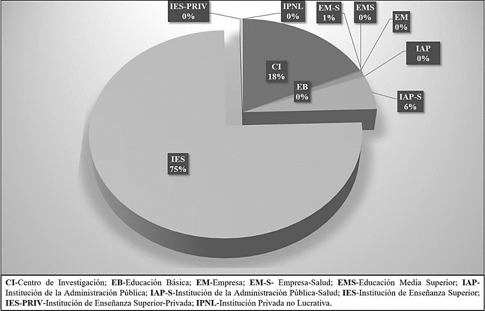Hay una importante participación de instituciones relacionadas con el sector salud, tanto del sector público como del privado; las de mayor participación en orden descendente a la magnitud de su producción científica acumulada publicada son la Secretaría de Salud (354), los centros de salud y hospitales pertenecientes al Instituto Mexicano del Seguro Social (79) y el Hospital Ángeles (53).