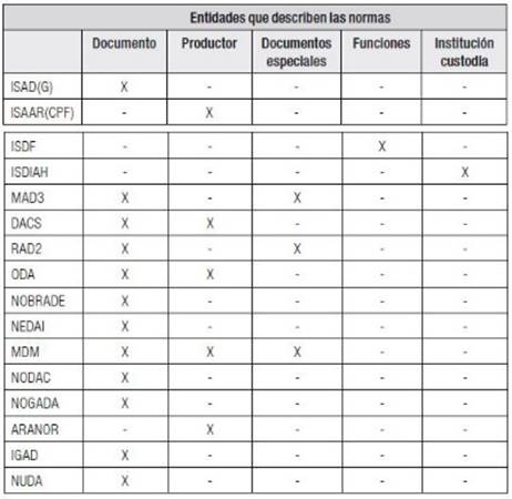 A través de la mayoría de estas normas se pueden representar los documentos de archivos, no sucediendo lo mismo con los productores, las funciones, las instituciones de custodia, los documentos especiales o la normalización de puntos de acceso. La siguiente tabla es un referente y ejemplifica las entidades archivísticas que describen las normas publicadas.