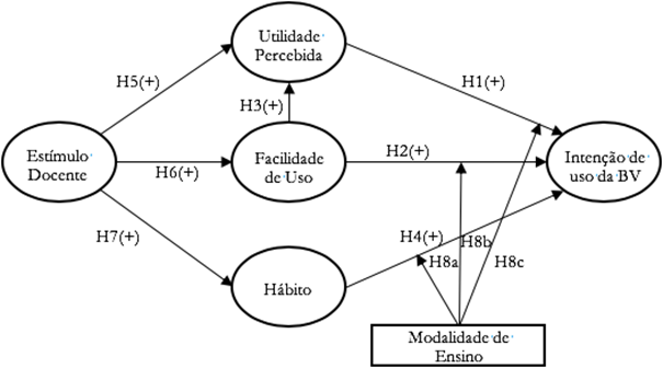 Os alunos da EAD possuem maior contato com a tecnologia, devido à utilização de um ambiente virtual de aprendizagem nos seus estudos (Ribeiro, Mendonça e Mendonça, 2007). Com isso, pressupõe-se que estes alunos possam apresentar diferenças de percepção na utilidade percebida, na facilidade de uso e também no hábito. Portanto, com a finalidade de explorar também a modalidade de ensino, ou seja, se há diferença na intenção de uso da biblioteca virtual entre os estudantes de graduação do ensino presencial e da EAD, foi incluída ao modelo conceitual desta pesquisa a variável “modalidade de ensino” para moderar a relação das variáveis “facilidade de uso”, “utilidade percebida” e “hábito” com a “intenção de uso” da biblioteca virtual.