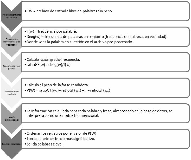 El análisis automatizado del documento comienza con la identificación de las palabras candidatas, tomando en consideración las palabras delimitadoras, los delimitadores de frases, la posición de stopwords y los signos de puntuación. Para poder identificar y extraer las palabras simples y compuestas, se aplica el método RAKE, el cual es descrito en la Figura 3. Una vez definidos los puntos anteriores, se aplican los siguientes pasos para la obtención: