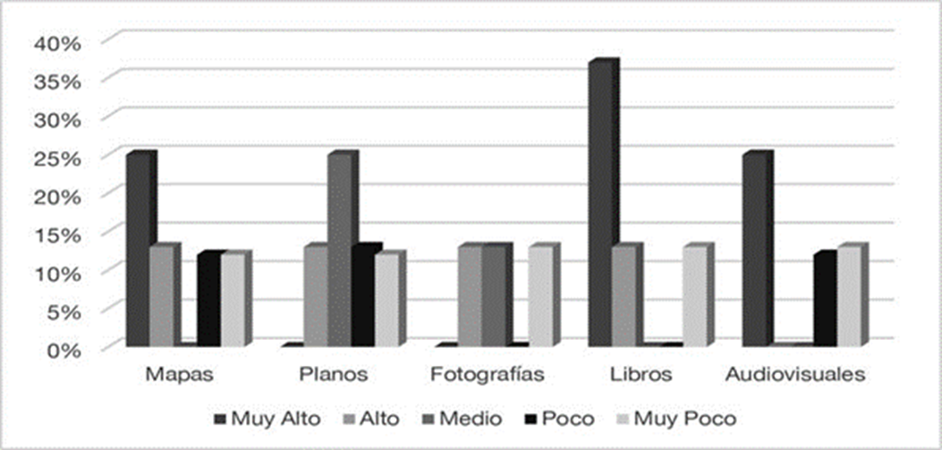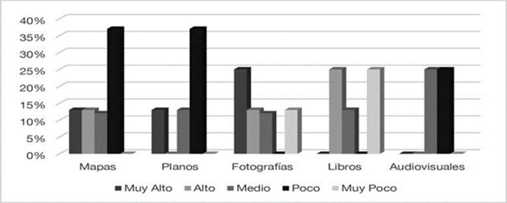 En la Figura 3 se observa una frecuencia de interés Muy alto en los tipos de documentos libros, mapas y audiovisuales, con 37 % y 25 %. A nivel Medio de interés destacan los planos y fotografías. En contraste con las entrevistas de participantes, se obtiene que el nivel de interés es un factor de deseo por encontrar información en esos tipos de documentos o soportes, por lo que la tendencia sigue apuntando hacia mapas, planos y fotografías de arquitectura moderna en AHT.