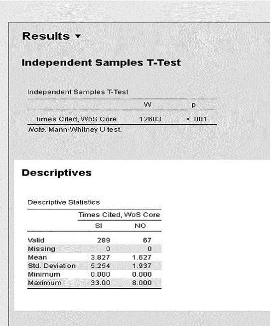 De esta forma, lo que se conseguía era recuperar los artículos que coincidiesen en los datos de PMID o DOI, tanto en la hoja Altmetric como en la de los datos de la Web of Science, y se añadiría la puntuación de Altmetric en la columna correspondiente. Los artículos que no tuviesen ese dato (aparece con el dato N/D) tendrían un 0, porque significaría que no se ha hecho difusión en redes sociales. Una vez recuperados todos estos datos se realizó una prueba T, se comparó la variable de número de citas recibidas en la Web of Science con la difusión realizada en redes sociales, en la que se vio que los artículos de los que la columna Altmetric estaba a 0, por lo que se puede pensar que no se había realizado difusión a través de redes sociales o con presencia en los recursos que analiza Altmetric, tenían una media de 1,62, mientras que los que tenían dato de Altmetric tenían una media de 3,827 (Figura 5). Creemos que los datos nos muestran que se puede asociar un aumento de citas en aquellos artículos en los que se ha realizado algún tipo de difusión. Aunque el archivo que nos ofrece el Explorer de Altmetric da más información de dónde se ha compartido una referencia, el análisis se limitó a la correlación de citas y puntuación de Altmetric, ya que se quería conocer la difusión en general, no en recursos en concreto.