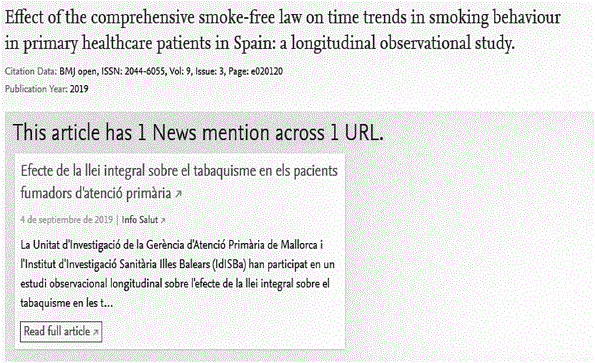Podemos encontrar diferentes recursos con los que podemos medir estas métricas alternativas, pero destacan Altmetric y PlumX, así que se incluyó esta información en las referencias bibliográficas publicadas en las noticias de infosalut.com. Cuando se publica la noticia, se debe incluir la información del DOI y/o el PMID para que pueda ser detectada y rastreada por estas herramientas. Esta información también se debe incluir en el tuit, para que éste sea rastreado por las métricas alternativas.