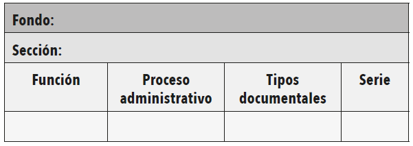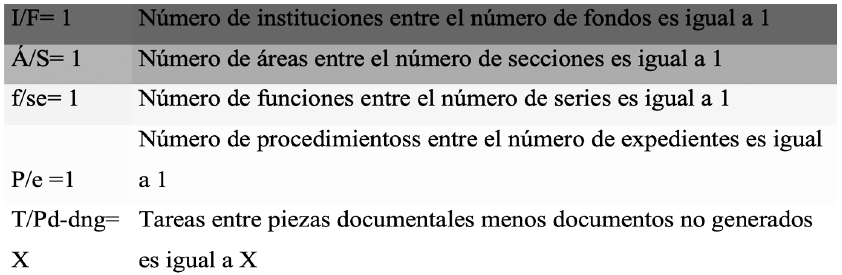 De esta manera, cada uno de los componentes de la estructura institucional se relaciona con un grupo documental específico. Si se lleva al terreno de lo cuantificable, entonces se aplica una fórmula matemática por cada elemento en donde el resultado debe ser 1, con excepción del último cuadro en el que algunas tareas no necesariamente generan piezas documentales.