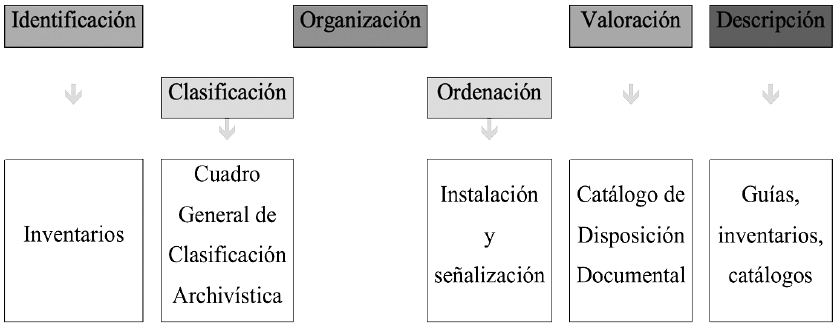 Así, son procesos propios de la gestión documental: identificar documentos producto de las funciones institucionales, organizarlos para generar Cuadros de Clasificación, valorarlos para determinar su destino final a partir de los Catálogos de Disposición y describirlos con base en las normas nacionales e internacionales para generar guías, inventarios y catálogos.