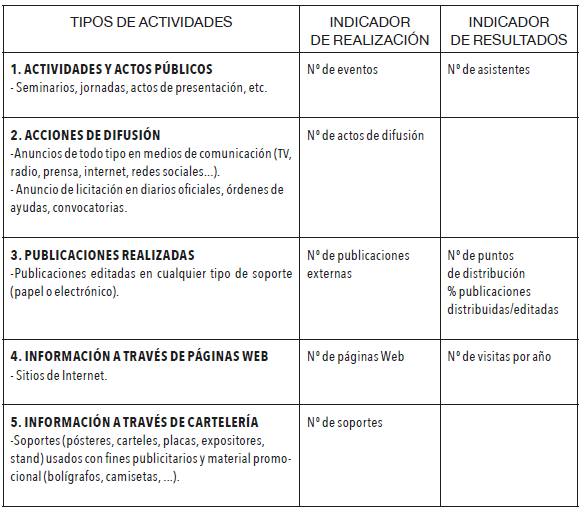 La actividad de la difusión permite que los archivos tengan una mayor proyección y visualización hacia el exterior a partir de los servicios y los productos que se ofertan (Campos 2009, 188). Y, aunque no se contempla para ser auditada, vale la pena incorporarla a los procesos archivísticos auditables. De allí entonces que auditar dicho aspecto se enfoque en ambos elementos. El Fondo Europeo de Desarrollo Regional propuso para el periodo 2014-2020 una serie de indicadores de esta índole, que clasificó en actividades y actos públicos, acciones de difusión, publicaciones realizadas, información a través de páginas web e impresos. Llevando los mismos indicadores al terreno archivístico, la auditoría estaría basada en: