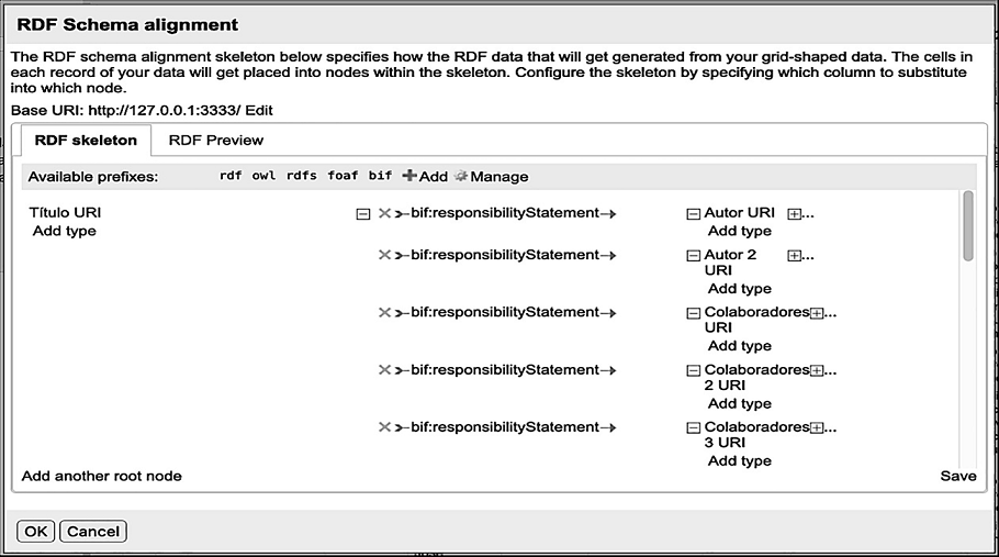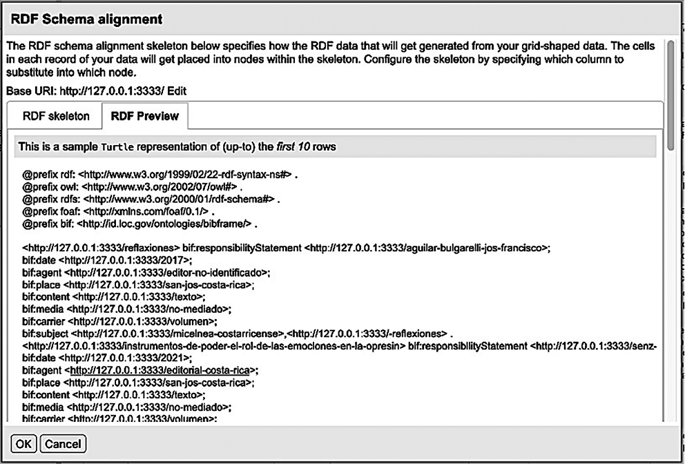 A partir del vocabulario de BIBFRAME incluido al programa Open Refine se crearon las tripletas que permitieron establecer las URI`s para relacionar los datos. Estas tripletas se definieron a partir del conjunto de datos de los registros bibliográficos seleccionados de la Biblioteca Nacional de Costa Rica.