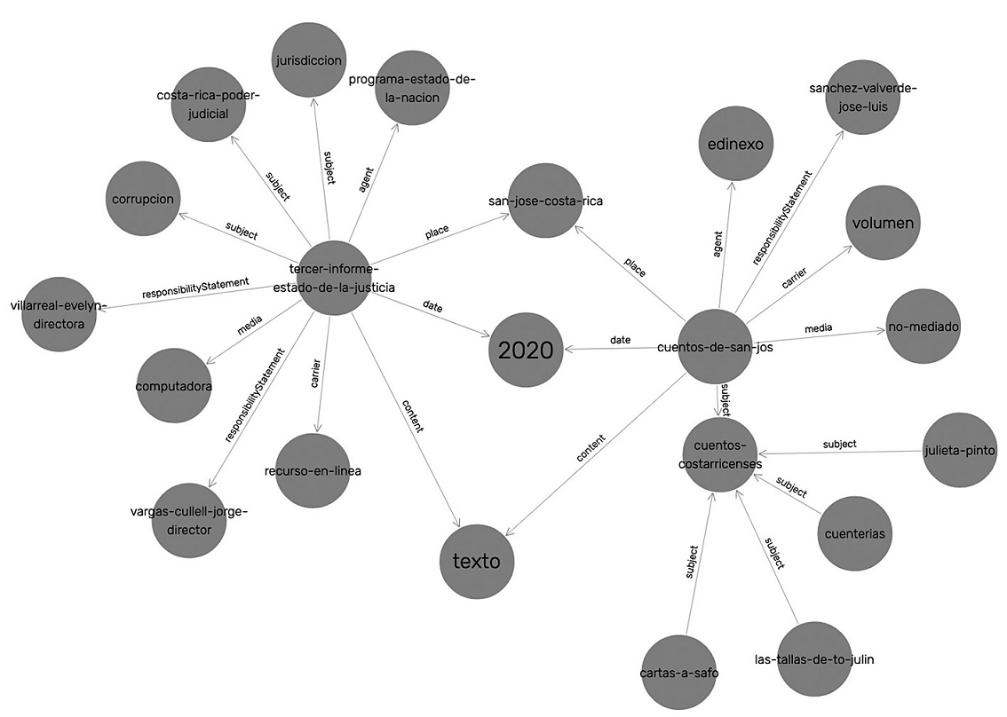 Respecto al proceso de visualización de datos fue posible a la herramienta Graph DB la cual es una base de datos orientada a grafos que permite una visualización de datos en forma de grafos en donde cada uno se puede interrelacionar y recuperar mediante URI`s asignados; Con dicha herramienta se pudo realizar consultas avanzadas para encontrar vinculaciones específicas entre datos, lo cual tiene una gran utilidad para su análisis ya que se pueden identificar así conexiones más evidentes entre los datos. En el conjunto de datos utilizados de la Biblioteca Nacional de Costa Rica, se pudieron establecer relaciones entre sus diversas entidades (obra, expresión, manifestación, personas y corporativas) y entre dichas entidades y sus atributos específicos.