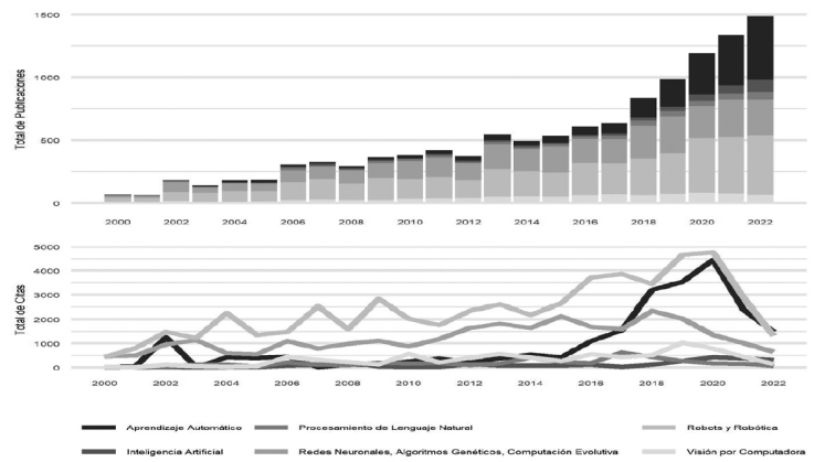 Aunque la producción de IA en México no ha sido estudiada desde un enfoque bibliométrico, hay investigaciones relevantes. Lancho-Barrantes y Cantú-Ortiz (2019: 501-502) revisaron la producción científica de México entre 2007 y 2017 a través de 177 574 publicaciones indexadas en Scopus y clasificadas por disciplinas. En este artículo, la cantidad de trabajos en ciencias de la computación es mucho menor respecto de las disciplinas que ocupan los primeros lugares (506). Sin embargo, los autores destacan a Oscar Castillo, Patricia Melin, investigadores en redes neuronales artificiales, y Leonid Fridman, del área de robótica, como los investigadores más citados en toda la base de datos (509). Arencibia-Jorge et al. (2023:10) usaron técnicas bibliométricas para analizar la producción científica mexicana en varias disciplinas, observando en la IA patrones similares a los globales.
