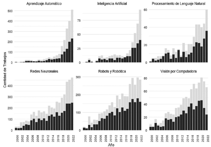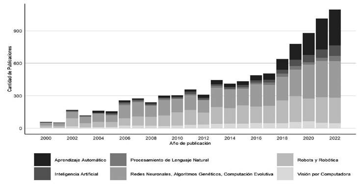 La Figura 2 presenta la distribución de las publicaciones según su autoría nacional o internacional. Las colaboraciones internacionales inician en el 2000; constituyen 44% de la producción total y tienden al incremento. En AA, la colaboración supera a la producción nacional durante varios años, alcanzando 55% en el 2022. En ese mismo año, la colaboración en VC es de 64% y en el área genérica de la IA ascendió a 57%. En RNA y ROB la cantidad de colaboraciones se incrementa entre 2% y 5% por año, pero manteniéndose ligeramente por debajo de 50%: