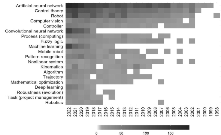 Para el análisis del desarrollo temático se seleccionaron los cinco primeros conceptos atribuidos a cada artículo que contaran con una frecuencia de repetición de diez o más veces en toda la base y se estudió su progreso. Una visión general de los conceptos con mayor producción en 2022 presenta dos agrupaciones. En la primera están aquellos que evolucionaron a lo largo de las últimas tres décadas; por ejemplo, las RNA, la teoría del control, la VC y el diseño de robots. En la segunda se incluyen los que progresaron rápidamente en los últimos años: el AA, las redes neuronales convolucionales y el AP. Tanto por su progresión como por la cantidad de la producción reciente, todos los mencionados forman un grupo de conceptos consolidados. La Figura 5 evidencia los veinte más frecuentes: