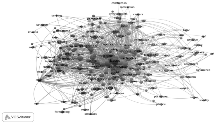 La Figura 6 demuestra el análisis de modularidad, que reveló tres principales agrupamientos: uno vinculado a modelos de aprendizaje automático, reconocimiento de patrones y procesamiento del lenguaje; otro asociado a diseño y estudio de robots; y un tercero relacionado con la visión por computadora. En la periferia, se identificaron términos aplicados al aprendizaje automático como “language”, “social”, “industry”, “disease”, “water” y “risk”, y aspectos específicos del diseño de robots, como “force”, “arm”, “position” y “stability”.