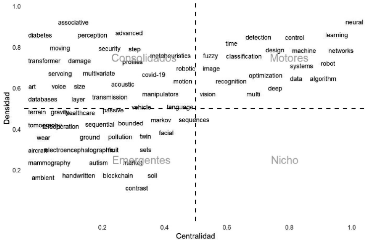 Los temas motores tienen alta centralidad y densidad, siendo fundamentales y bien desarrollados. Es el caso de los aprendizajes automático y profundo, los robots, el reconocimiento de imágenes y los procesos de optimización y clasificación.