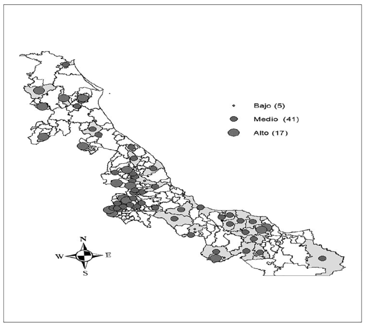 Dentro de la primera etapa, filtramos los registros del estado de Veracruz y depuramos la columna de cada municipio para posteriormente realizar el análisis geoestadístico de la información. Además, se agregó el índice de rezago social categorizado en los niveles ‘alto’, ‘medio’, ‘bajo’, y se asignó acorde al municipio de pertenencia de cada biblioteca. Finalmente, se incorporó la regionalización de Veracruz.