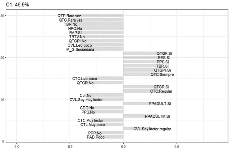 El segundo grupo está conformado por el 42.6 %. Se destaca que existe una alta tendencia por rara vez promover, compartir o platicar acerca de lo que leen en su biblioteca (QTP y QTC). Además, practican con poca frecuencia la lectura, no se consideran lectores de literatura y leen muy poco los libros disponibles en su biblioteca (CVL y QTL). No obstante, sí realizan actividades para promover a las bibliotecas públicas como espacios relevantes dentro de su entorno (RAP). Por otra parte, sus bibliotecas no tienen vínculos con alguna institución y tampoco han hecho actividades de promoción de la lectura (TBTV y TBR). Este grupo se caracteriza por no haber recibido formación por parte de la DGB y no ha organizado ni participado en algún evento sobre promoción de la lectura (CDG y HPO). El máximo grado de estudios que prevalece es secundaria. Tampoco es común que practiquen actividades de escritura o de lectura en sus actividades diarias (QTE y PAD), y los que llegan a realizarlas lo hacen en un tiempo menor a dos horas a la semana (Figura 3).