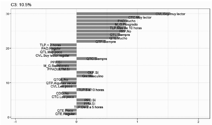Finalmente, el tercer grupo está representado por el 10.5 %. Son los que practican la lectura con bastante frecuencia; se catalogan como lectores de literatura (QTL, CVL y CTC): la lectura es muy frecuente en sus actividades diarias y lo hacen por más de 10 horas a la semana (TLP). El grado de estudios que prevalece es el posgrado. No es común que hayan realizado programas de promoción para niños de primaria (PPP). Además, tienden a practicar mucho la escritura. En la misma medida, comparten, platican y promueven lo que leen con las demás personas en la biblioteca (QTP y QTC). Indicaron que las bibliotecas en las que trabajan sí ofrecen libros en formato digital (OLF). Finalmente, resalta el hecho de que existe una ligera tendencia a ser del género masculino (Figura 4).