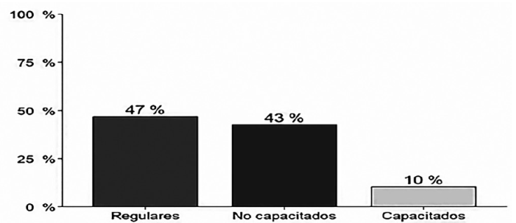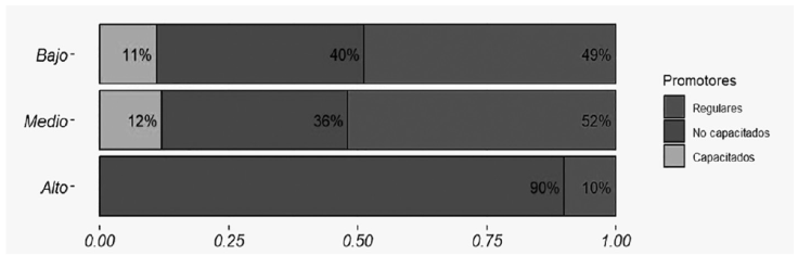 En la Figura 6 puede notarse que 90 % de las bibliotecarias y bibliotecarios de municipios con alto rezago social están dentro del grupo de promotores no capacitados, mientras que el restante 10 % está dentro de los regulares. Por otro lado, las proporciones no parecen variar significativamente para las bibliotecarias y bibliotecarios de municipios con un índice de rezago social medio y bajo. No obstante, destaca que las bibliotecarias y bibliotecarios cuyo municipio está en un nivel medio y bajo, la proporción es aproximadamente del 50 % como promotores regulares, 40 % como promotores no capacitados, y únicamente 1 de cada 10 como capacitado. La evidencia sugiere que estas diferencias son estadísticamente significativas y que el nivel del índice de rezago sí influye sobre sus competencias en promoción de la lectura (Ji-Cuadrada = 9.986, p-valor = 0.0440).