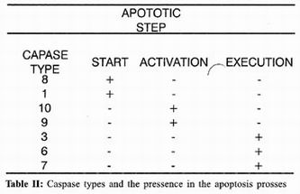Nevertheless, activation of the program does not solely require presence of functional receptors in membrane of cells destined to die. For example, death mediated by activation of APO/FAS only occurs during certain states of maturation of progenitor cells of T or B–Iymphocytes. In the case of TNF, receptors of this cytokine are present in all cells of the body, but they only activate the death program when transformation toward a tumor–like cell or virar infection produces an internal cellular change that allows the death program to have an effect. In addition, ligands associated to induction of programmed cellular death do not solely induce death. For example, endothelial cells that cover the interior of the vessels have TNF receptors and their activation is an indispensable step for the inflammatory response. In this case, activation of TNF receptors does not promote cellular death, but rather activation of the, endothelium. However, if endothelial cells cultivated in vitro are treated with protein or RNA synthesis inhibitors such as actinomycin D or cycloheximyde, TNF induce death by apoptosis. This observation demostrates that TNF ignites the death program in all cells it stimulates, but cells actively express gene products that protect them; in addition, if these products are not synthesized, the death program follows its course and the endothelial cell dies by apoptosis. The second activation mechanism of the death program consists of a constituent ignition as part of the state of maturation or differentiation characteristic of a cellular lineage. In these cases, death is prevented by action of survival factors, also denominated trophic factors, which if present in the environment interfere with execution of the death program (figure 1, diagram II–b).
