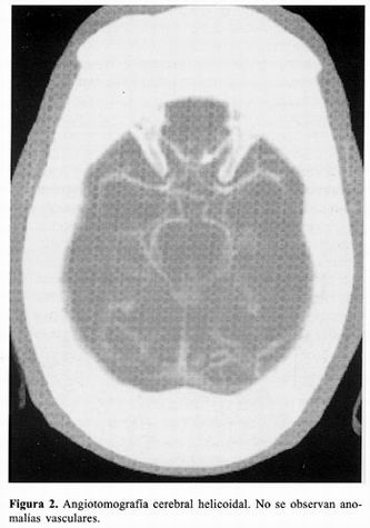 La angiotomografia cerebral helicoidal se realizó al tercer día y no se observó ninguna malformación vascular intracraneal (figura 2). La angiografía carotídea izquierda por inyección intraarterial del contraste yodado no evidenció lesiones aneurismáticas (figura 3).