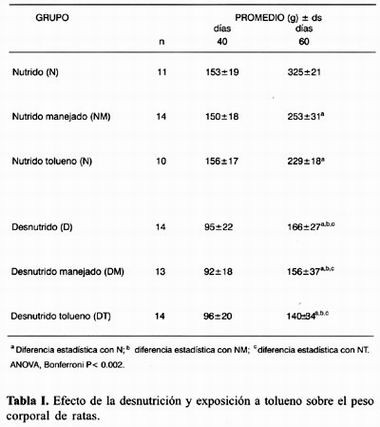En el presente estudio, los hallazgos indican que la desnutrición provocada durante la gestación, lactación y después del destete hasta los 60 días de edad y asociada con inhalación de tolueno en la etapa juvenil de los 40 a los 60 días de edad, reduce significativamente el peso del cuerpo de los animales desnutridos a más del 50 % (Tabla I) comparado con los testigo. La reducción del peso corporal también se ha registrado en estudios previos empleando un régimen similar. 16