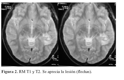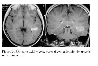 La evolución posoperatoria fue satisfactoria presentándose al egreso sin datos neurológicos agregados. No recibió tratamiento complementario. En la RM de control se reporto lesión isointensa con reforzamiento homogéneo a la administración de gadolinio localizada en la encrucijada temporo occipital izquierda, adyacente al atrio ventricular, con discreto edema perilesional, sin evidencia de hemorragia reciente.