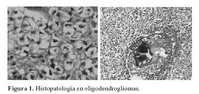Los oligodendrogliomas se caracterizan por tener células con núcleos redondos y ovales, cuyo nucléolo es ligeramente prominente. Las prolongaciones citoplásmicas de los tumores bien diferenciados son muy escasas y cortas. Los halos perinucleares le dan el aspecto de "huevo estrellado", y se considera un artificio de fijación (figura 1). En las formas anaplásicas o malignas, los oligodendrogliomas, al igual que otros gliomas, presentan notable pleomorfismo, anaplasia, necrosis y vasos tumorales con gran prominencia de las células endoteliales.