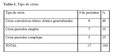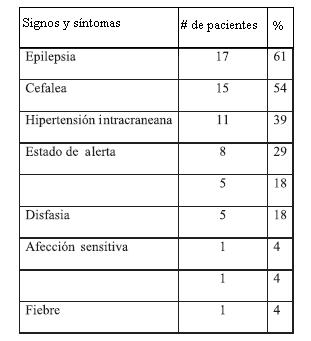 El síntoma más frecuente fue la presencia de crisis convulsivas que se presentaron en 17 pacientes (61%). De los 17 pacientes con epilepsia, ocho pacientes presentaron crisis convulsivas tónico clónico generalizadas de inicio (40%), crisis parciales simples en siete pacientes (35%), y crisis parciales complejas en cinco pacientes (25%) (tabla 1). Quince pacientes presentaron cefalea (54%), cinco (18%) afección motora, y un paciente (4%) afección sensitiva. Cinco pacientes (18%) presentaron disfasia, cuatro de tipo motor y uno de tipo mixta. Ocho pacientes se presentaron con alteración del estado de alerta (29%) no relacionado a estado postictal, seis con somnolencia y dos con estupor superficial. Un paciente (4%) presentó parálisis facial central y uno más (4%) presentó fiebre. Once pacientes (39%) presentaron papiledema al momento del primer examen neurológico. Estos once pacientes presentaron también cefalea, náusea y vómito, diagnosticándose hipertensión intracraneana (tabla 2). La suma de los porcentajes es mayor a 100 debido a que un solo paciente podía presentar varios síntomas.
