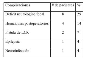 Las complicaciones que se presentaron fueron déficit neurológico focal en ocho pacientes (29%), cuatro pacientes con hematomas posoperatorios del lecho o hemorragia intraventricular (14%), fístula posoperatoria de líquido cefalorraquídeo en dos pacientes (7%), epilepsia posoperatoria en un paciente (4%), y neuroinfección en otro (4%). Tres pacientes presentaron muerte operatoria (11%), uno de ellos por broncoaspiración posterior a una crisis convulsiva (tabla 5)