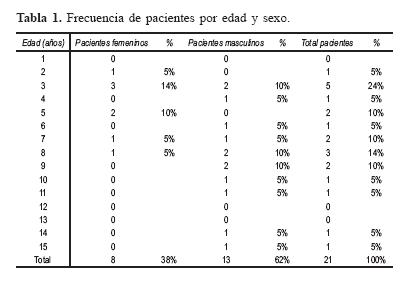 Se estudiaron 21 pacientes con diagnóstico de meduloblastoma de edades comprendidas de 0 a 16 años, con una edad media de 6.4 años, una media de 7 años y moda de 3 años. En cuanto a distribución por sexo, 8 pacientes femeninos (38%) y 13 masculinos (62%), (tabla 1); (gráfica 1).