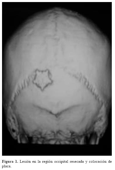 Se reporta un paciente masculino de 28 años de edad con dolor en región occipital, posterior a un traumatismo de cráneo, sin ninguna otra sintomatología de importancia. El examen neurológico fue normal. Se indico una radiografía simple de cráneo anteroposterior y lateral observándose una lesión radiolúcida en la región occipital, motivo por el cual se práctico una cirugía para resección biopsia, reportando un granuloma eosinófilo, su evolución posoperatoria fue satisfactoria (figura 1).