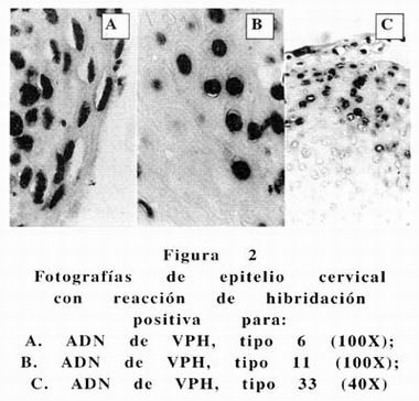 En todas las biopsias positivas para cualquiera de los tipos virales de VPH la señal de hibridación siempre se encontró en los estratos más superficiales del epitelio estratificado.