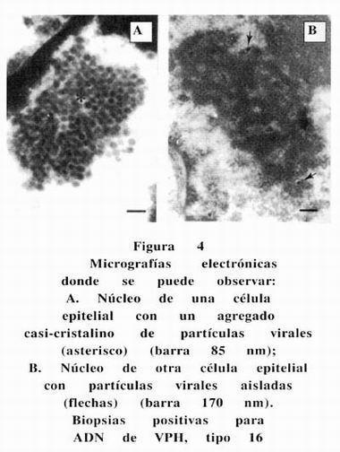 En cuanto al análisis ultraestructural, desafortunadamente existen muy pocos antecedentes de los cambios ultraestructurales asociados a infección genital por VPH, el único referente con que se cuenta es un reporte de Sato y cols., de 1987, donde muestran datos de 37 pacientes que incluyen toda la gama de lesiones asociadas a infección genital por VPH, desde condiloma acuminado hasta carcinoma in situ , pero dado que el objetivo del estudio es comparar la capacidad de detección de la inmunocitoquímica, microscopia electrónica de transmisión y Southern Blot, no se reportan los hallazgos ultraestructurales, solamente el número de casos en los que fueron capaces de detectar partículas virales por microscopia electrónica. 25