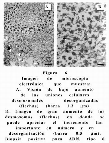 En casi todas las biopsias es evidente la desorganización de las uniones celulares denominadas desmosomas como se muestra en la figura 6.