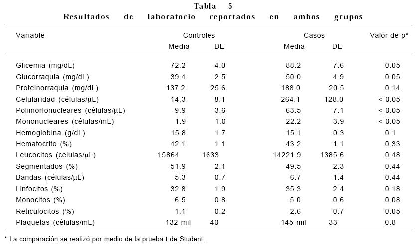 Material y métodos: Se estudiaron RN de pretérmino sépticos, con diagnóstico de meningitis (casos) y RN sépticos sin meningitis (controles). Se obtuvieron datos clínicos y valores de laboratorio, en los que se incluyeron: análisis citoquímico y citológico de líquido cefalorraquídeo (LCR), biometría hemática y química sanguínea; así como resultados de hemocultivos, recopiladas de los registros del Laboratorio de Microbiología del Departamento de Infectología e Inmunología Perinatal del Instituto Nacional de Perinatología (INPer).