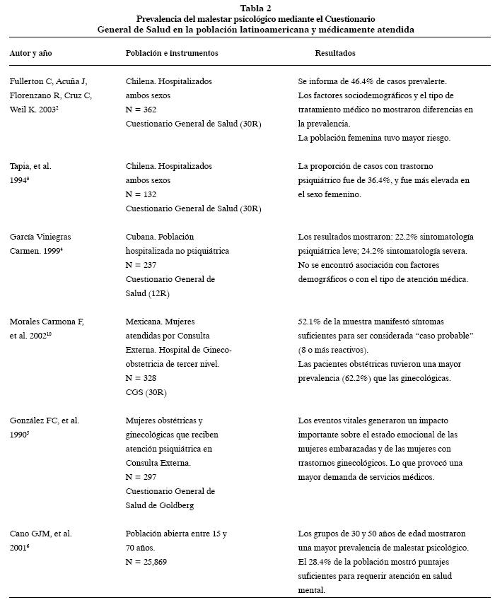 El malestar psicológico como concepto, se desprende de diversos análisis estadísticos y observaciones clínicas derivadas de la aplicación del Cuestionario General de Salud (Tabla 2) y de la utilización de otros instrumentos de tamizaje.21 Estos estudios nos han orientado al análisis de una gama de manifestaciones clínicas propias de la salud mental que se manifiestan como alteraciones psicológicas, clínicamente significativas y que responden a un evento disruptivo específico, pero que no cumplen con los criterios para ser consideradas como un trastorno mental. El concepto de malestar psicológico da cuenta, por lo tanto, a un intento de ampliar el espectro de salud mental con el que el individuo responde.